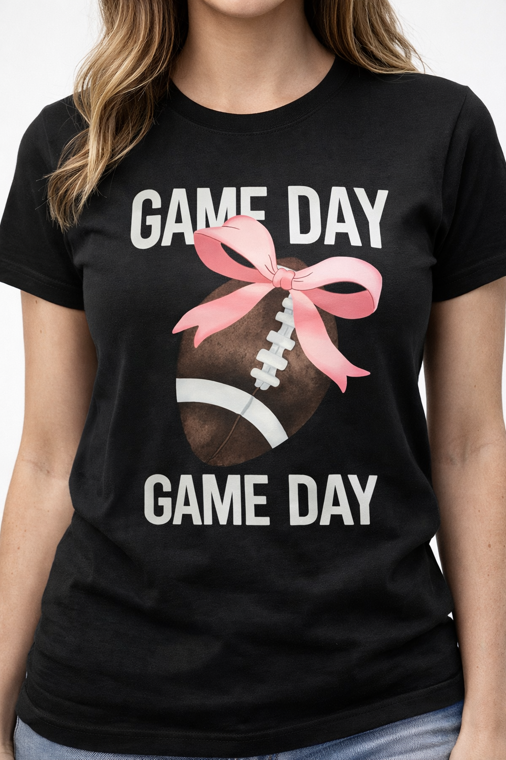 Design: A central graphic featuring a realistic brown football topped with a large, vibrant ribbon bow, framed by the words “GAME DAY” in bold, white block lettering.