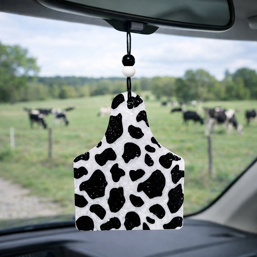 Handmade Cow Print Ear Tag Car Freshie – Farmhouse Edition