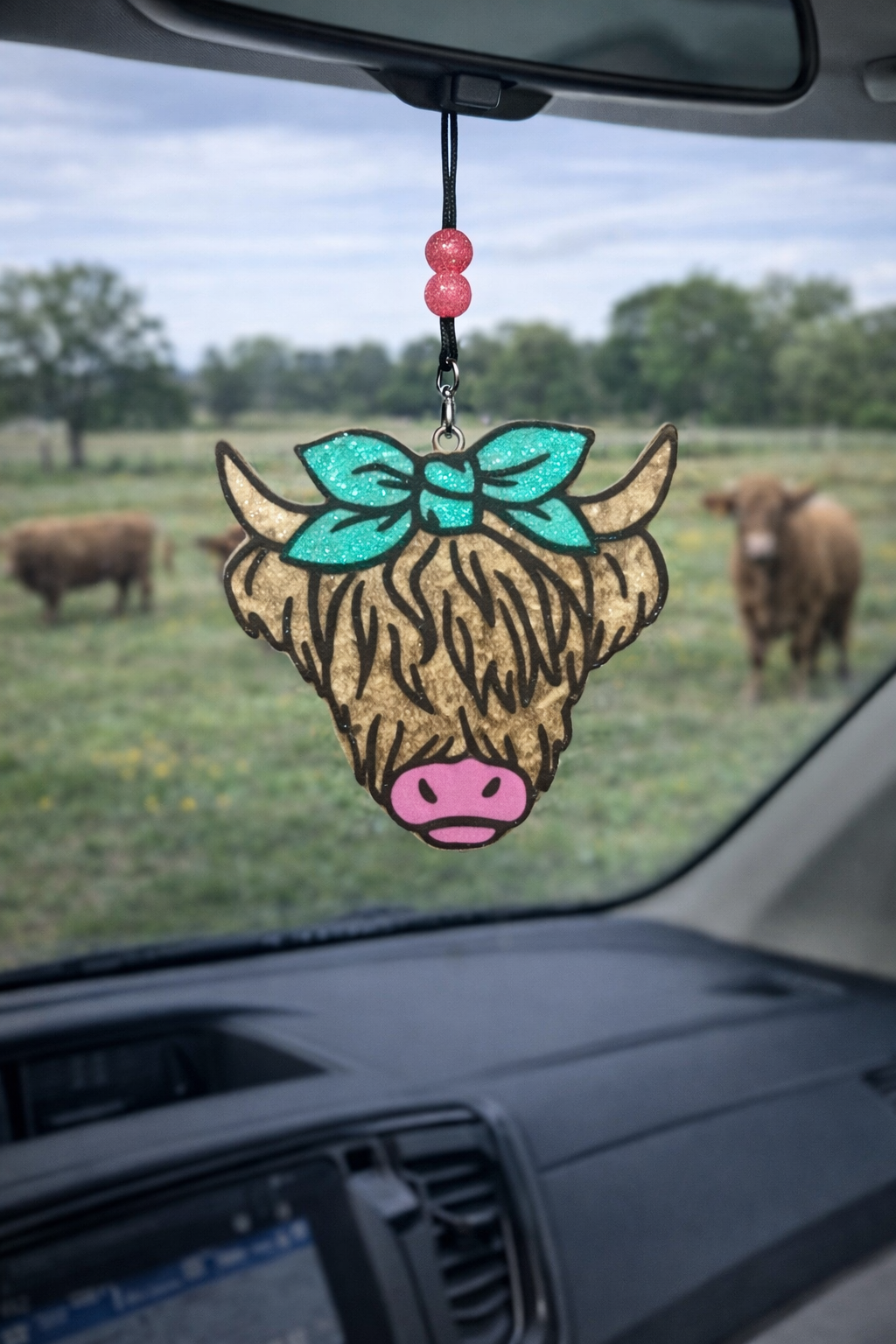 Handmade Highland Cow Car Freshie – Teal Floral Edition