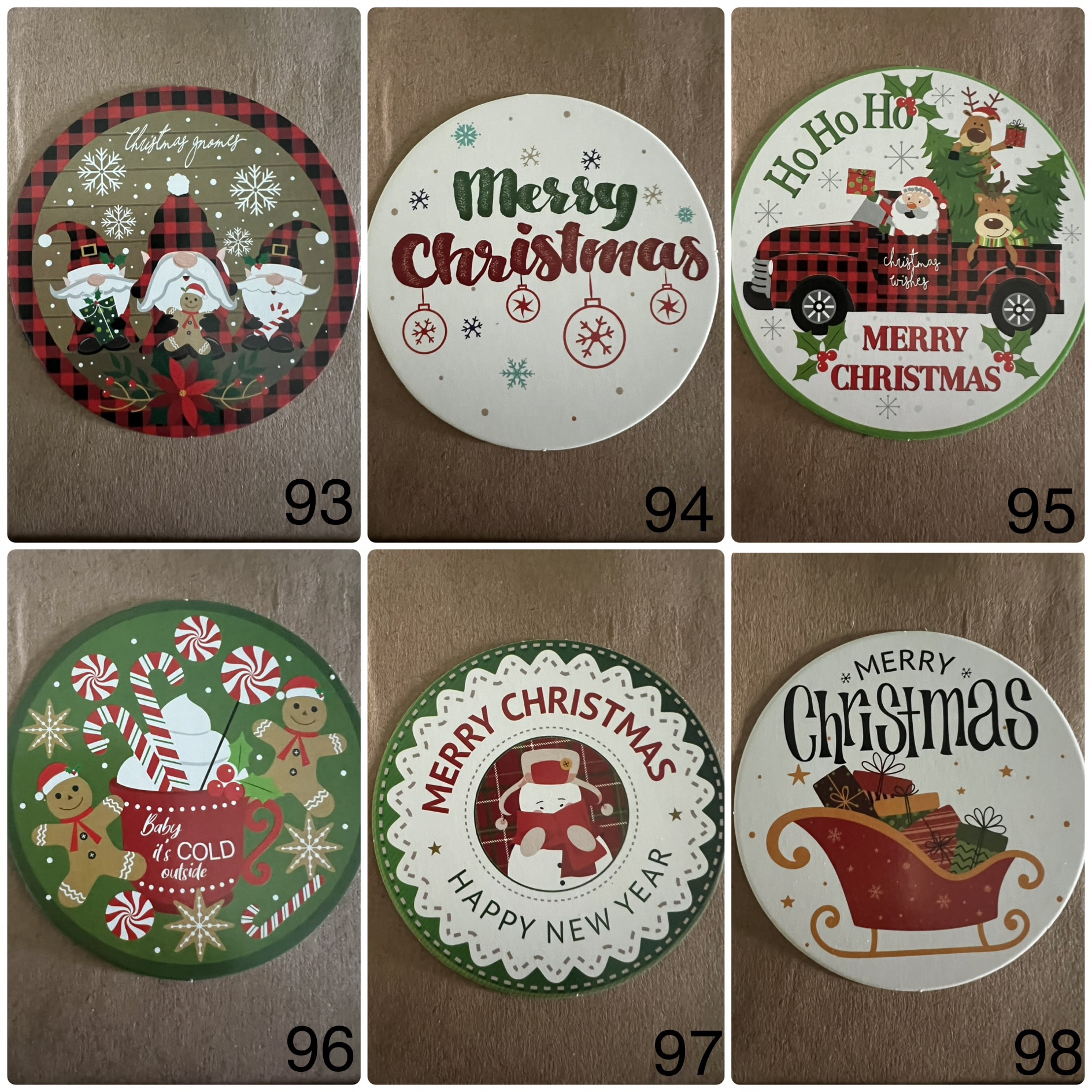 93. Christmas Gnomes (Red Plaid Background), 94. Merry Christmas (Ornaments & Snowflakes), 95. Ho Ho Ho Merry Christmas (Red Plaid Truck), 96. Baby It's Cold Outside (Gingerbread & Cocoa), 97. Merry Christmas Happy New Year (Snowman Seal), 98. Merry Christmas (Santa's Sleigh with Gifts)
