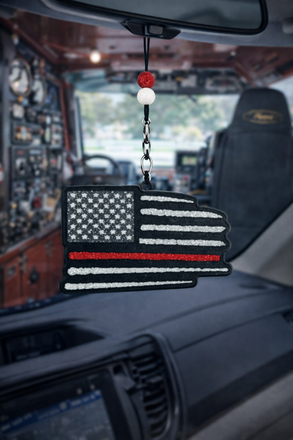 Honor our first responders with this striking Thin Red Line American flag air freshener. Crafted from durable Thermapol, this freshie is a meaningful way to show support for firefighters while keeping your vehicle smelling great.
